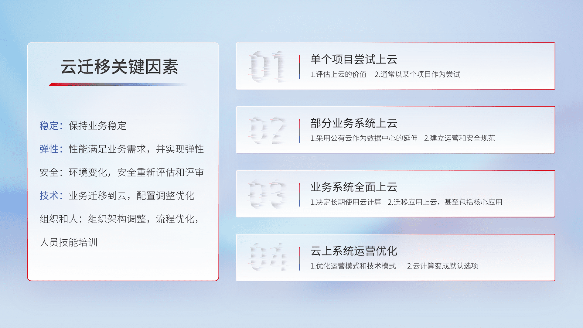 结合实际业务,,,从规划设计、、、云平台选型、、、云原生改造、、、、数据迁移、、、、集成交付,,迁移全过程为客户识别最佳上云路径,,,做好风险识别管理,,设计网络架构、、、身份权限、、安全审计合规、、、、操作审计、、、日志审计、、监控告警策略、、多站点容灾设计等,,对云上基础设施进行整体规划,,,提升IT治理水平,,,,以满足弹性、、高可用、、、、高性能的需求。。