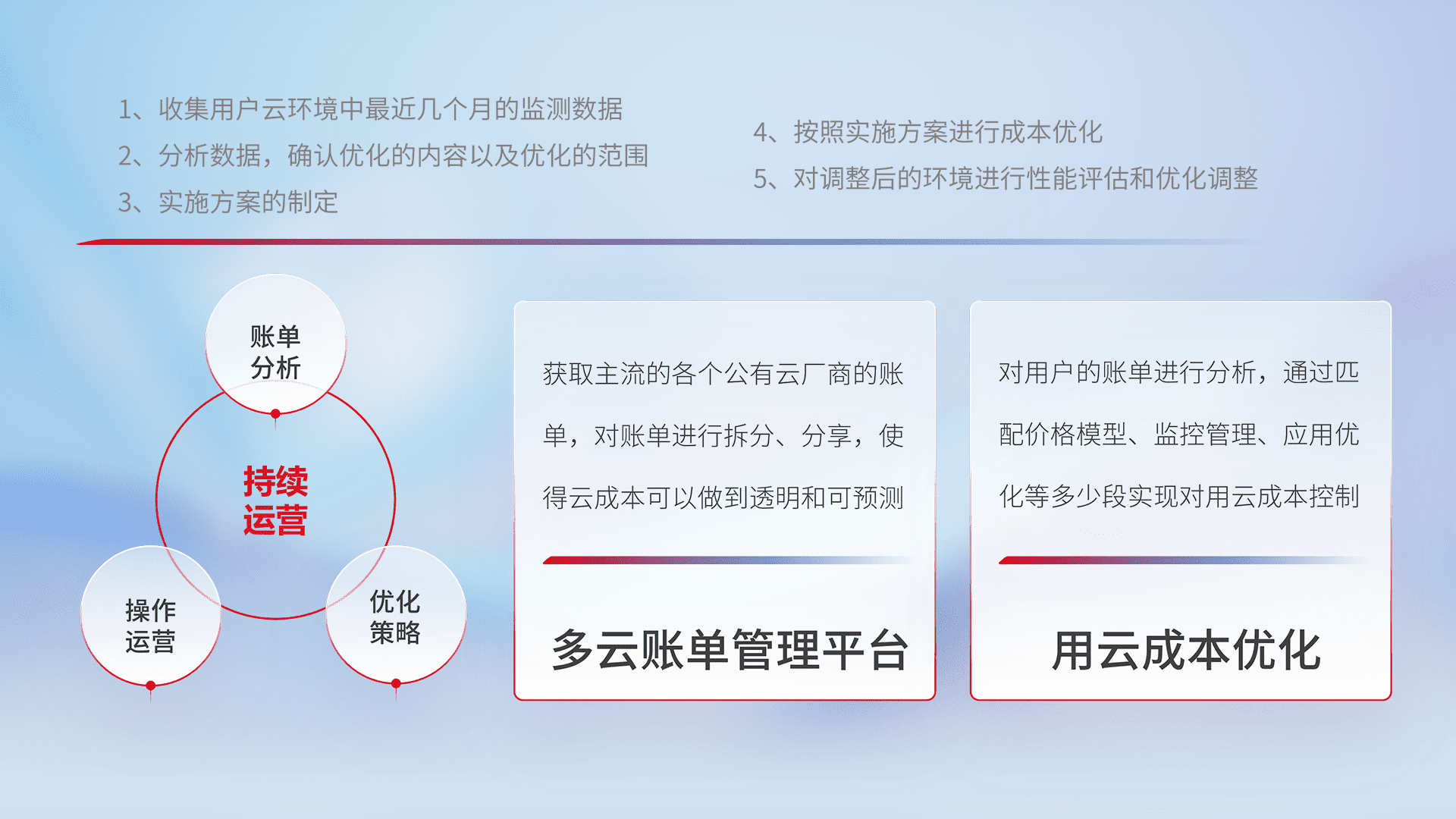 通过多云纳管,,以统一的资源数据模型把客户的云资源进行抽象和封装,,进而实现对多云资源的统一操作,,保障云资源管理的可靠性、、稳定性与可用性。。。。量身定制化运维内容,,配置、、、、开发运维、、、补丁管理、、备份、、监控、、、、认证和访问管理、、、审计和日常巡检等,,,,保障在用云过程中的可靠度,,稳定度以及高可用率。。。